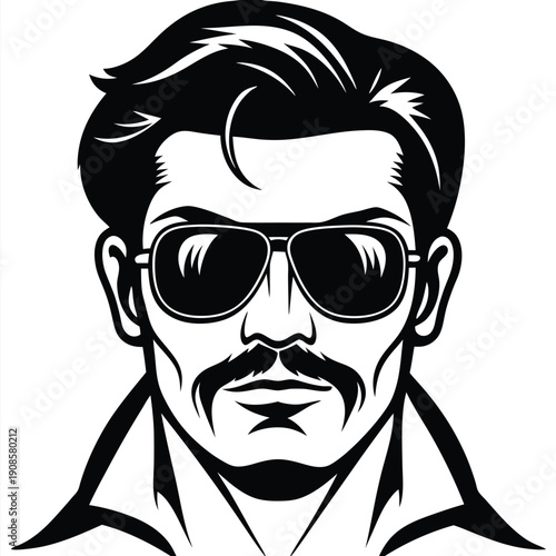 Retro Styled Portrait of Man with Moustache Wearing Sunglasses, Black and White Icon