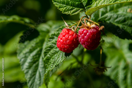 Ripe red raspberries on the branches of a bush. A raspberry patch in the garden