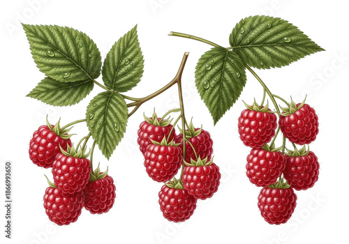 Ripe red raspberry clusters with detailed green leaves, intricate veins, and dew droplets, isolated on a transparent background with copy space, concept of natural freshness and healthy food