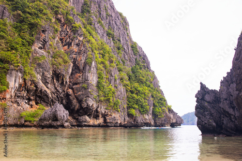 Rocky island in sea, neutral photo from tropical vacation. Unusual tropical landscape with sea and mountains.