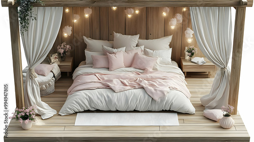 Romantic Canopy Bed with Pink Bedding and Floral Accents