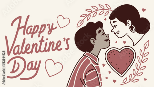 Romantic Happy Valentine’s Day Illustration With Couple Smiling, Hearts, And Decorative Leaves For Love And Holiday Design