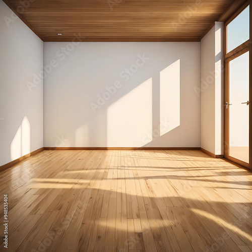 Room interior empty space background mock up, sunlight and shadows room walls, cozy summer warm room with sunlight and leafs shadows and wooden blank parquet floor