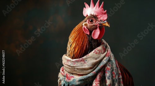 Rooster standing confidently in studio light, adorned with natural fabric scarf, freedom and awareness campaign generative ai