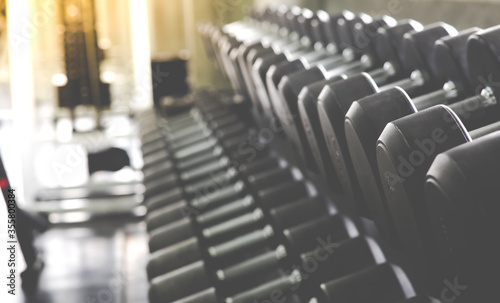 Row of dumbbell. Gym equipment and sport concept. Fitness Healthy lifestye and workout at gym concept.