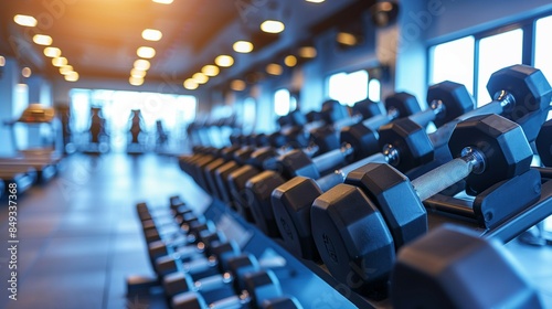 Row of dumbbells in the gym,blurred background,copy space,healthy fitness concept.