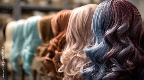 Row of various colorful synthetic wigs with different shades and wavy textures showcasing options for costume, beauty, and hair styling trends in a salon or retail setting