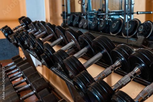 Rows of metal dumbbells on rack in the gym / sport club. Weight Training Equipment. - Image