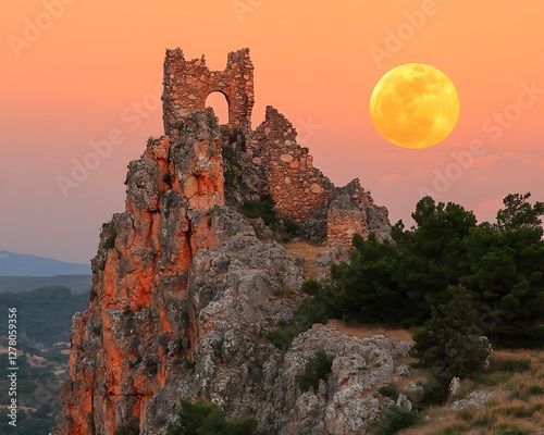 Ruined tower on peak, sunset moonrise