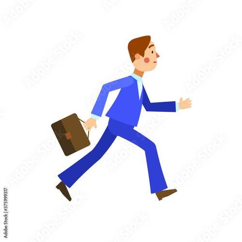 Running business man in a blue suit, with briefcase. Employee in a hurry. Flat design, cartoon vector illustration.
