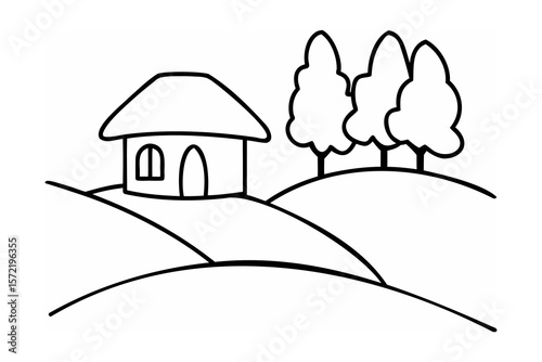 Rural house and trees on rolling hills landscape