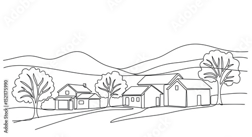 rural landscape with house tree mountain line art drawing