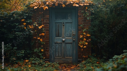 [Rustic blue shed with large window under fall foliage] Cozy Rustic Outhouse Nestled in Fall Forest