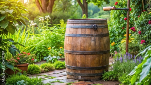 Rustic garden water barrel for collecting rainwater in eco-friendly backyard setting