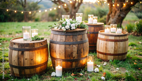Rustic wedding, old wooden barrel with candles decoration