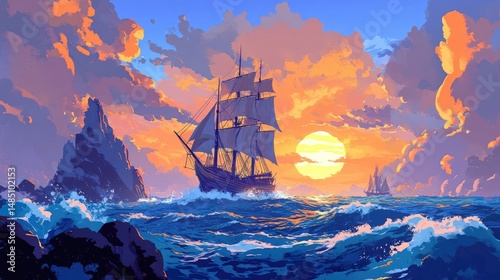 Sailing ship with sails on a stormy ocean at sunset beautiful sky with clouds