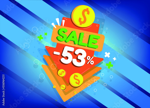 Sale discount, tags and arrow icons for promotion, fifty-three percent off, -53%