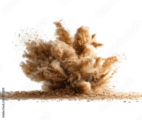Sand bursts outward in a dynamic explosion, particles suspended mid-air