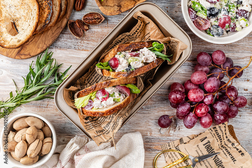 Sandwiches with chicken breast salad, grapes, tarragon and pecans on a wooden table.