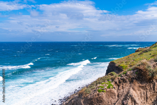 Santorini landscape - view of rugged cliffs and Aegean Sea, Greece