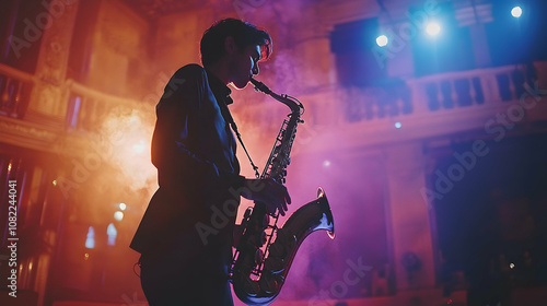 Saxophone Player on Stage with Fog and Lights - Illustration