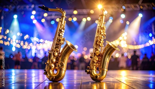 Saxophones illuminate vibrant stage lights creating atmosphere for live jazz performance