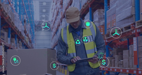 Scanning inventory with tablet in warehouse wearing high-vis vest, floating sustainability icons