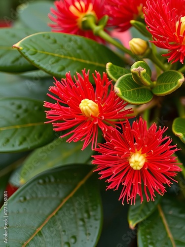 Scarlet pohutukawa flowers and green leaves close-up, showing intricate detail and texture, New Zealand flora, natural beauty