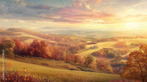 Scenic autumn landscape with pastel skies and rolling hills covered in fall foliage.