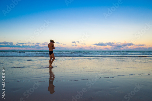 Scenic sunset view of a figure in a straw sun hat walking with his reflection on the shore of a wide tropical island beach