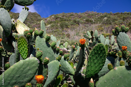 Scenic view on steep cliffs and rocks near Masca in Teno mountain massif, Tenerife, Canary Islands, Spain, Europe. Selective focus on blossoming prickly pear cactus plants along coastal hiking trail