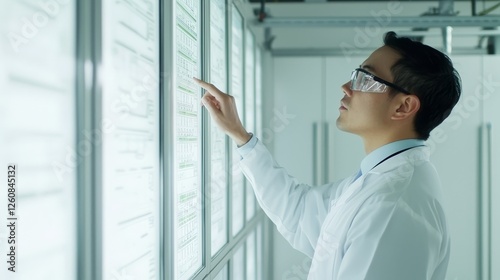 Scientist in lab coat analyzing complex data on whiteboard in modern laboratory setting