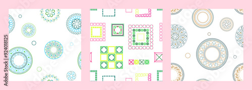 Seamless pattern of geometric shapes. Bright seamless pattern. Set of 3 patterns. Design for fabric, wallpaper, wrapping paper. Vector