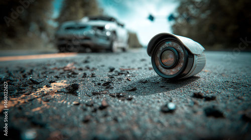 Security camera on the road with debris and a damaged car in the blurred background outdoors