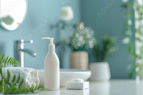 Selective focus of hygiene objects with bottle of eco body cream in bathroom, zero waste concept