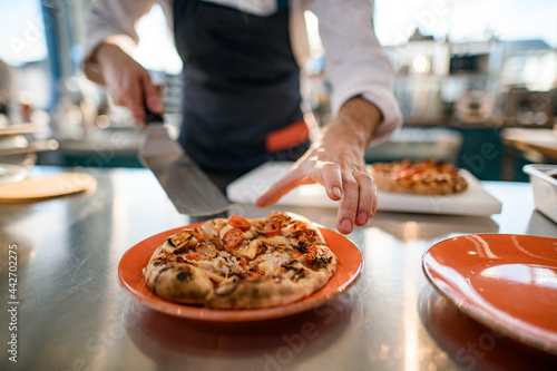 selective focus on delicious small round cut pizza in plate.