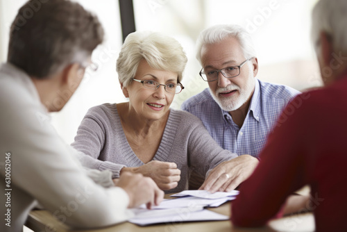 Senior couple discussing with financial insurance agent advisor. Generative Ai
