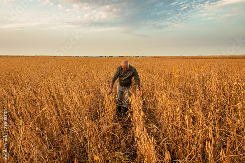 Senior farmer walking in soybean field examining crop at sunset.