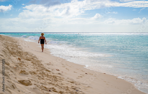 senior woman walks alone along the shoreline of a Caribbean beach with clear sand and deep blue water. The photo, taken from behind, highlights solo travel and retirement exploration on a sunny day