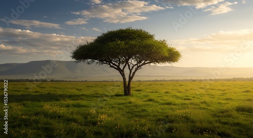 Serene African Savanna Landscape Single Acacia Tree at Sunset