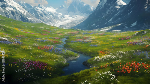 Serene Alpine Meadow: Vibrant Wildflowers and Majestic Mountains