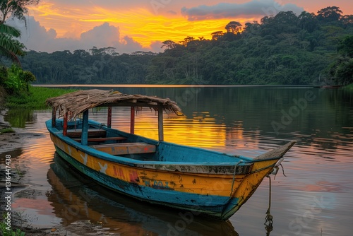 Serene Amazon River at Sunset – Traditional Wooden Boat and Lush Rainforest