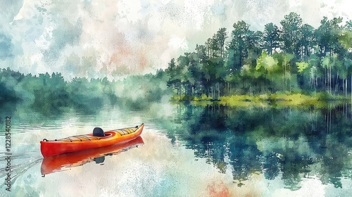 Serene Kayak Adventure on Foggy Lake Surrounded by Lush Forest