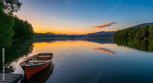 Serene lake scene at sunset with a wooden boat