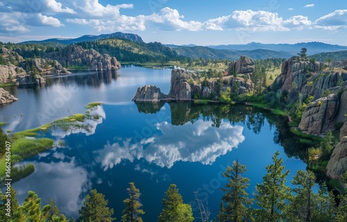 Serene lake surrounded by dramatic rock formations, mirrored skies