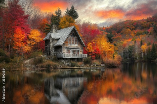 Serene Lakeside Retreat A Picturesque Cottage Nestled Amidst Autumn's Colorful Splendor at Sunset