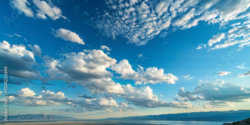 Serene Lakeside Scenery with Cumulus Clouds and Blue Sky