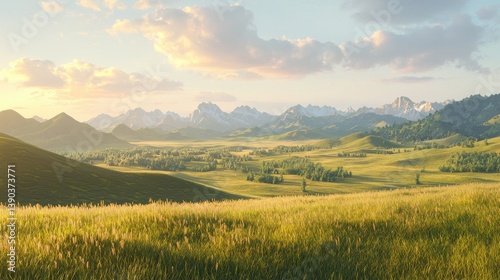 Serene Landscape: Golden Fields and Majestic Mountains Under a Soft Sky