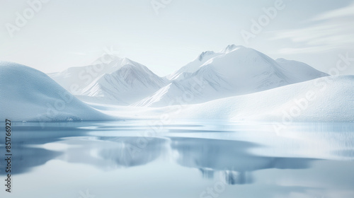 Serene Landscape of Minimalist Icy Mountains Reflecting in Frozen Lake. Background. Wallpaper.