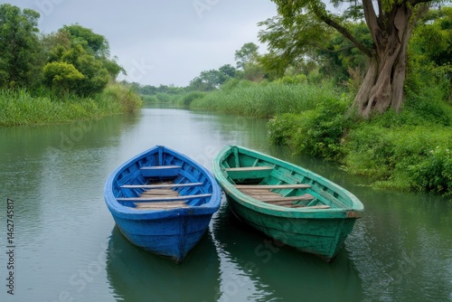 Serene River Scene: Two Colorful Boats Moored in Tranquil Waters